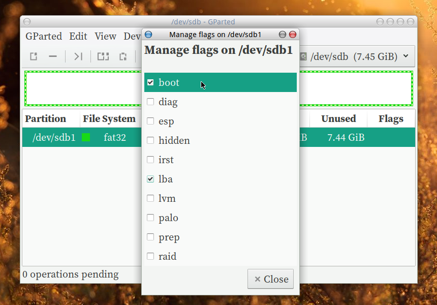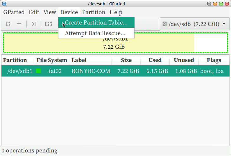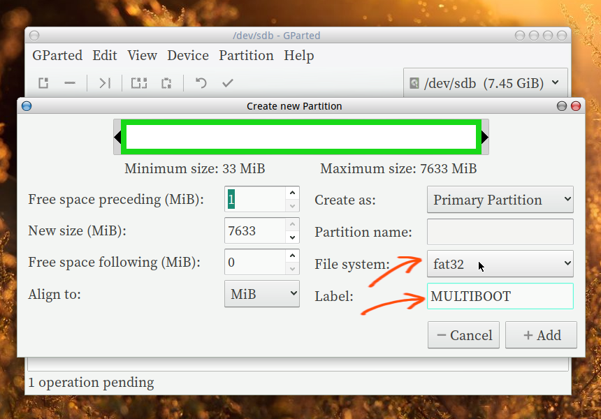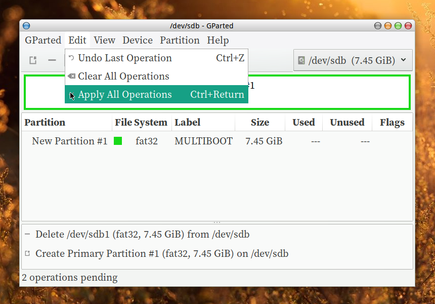 Here, the target is a drive with 'MSDOS' partition table, 'FAT32' partition with a label (MULTIBOOT) and 'BOOT' flag set. You can use your own weapon of choice; any disk partitioning tool which can do the aforementioned tasks. Here, using Gparted for aesthetics!